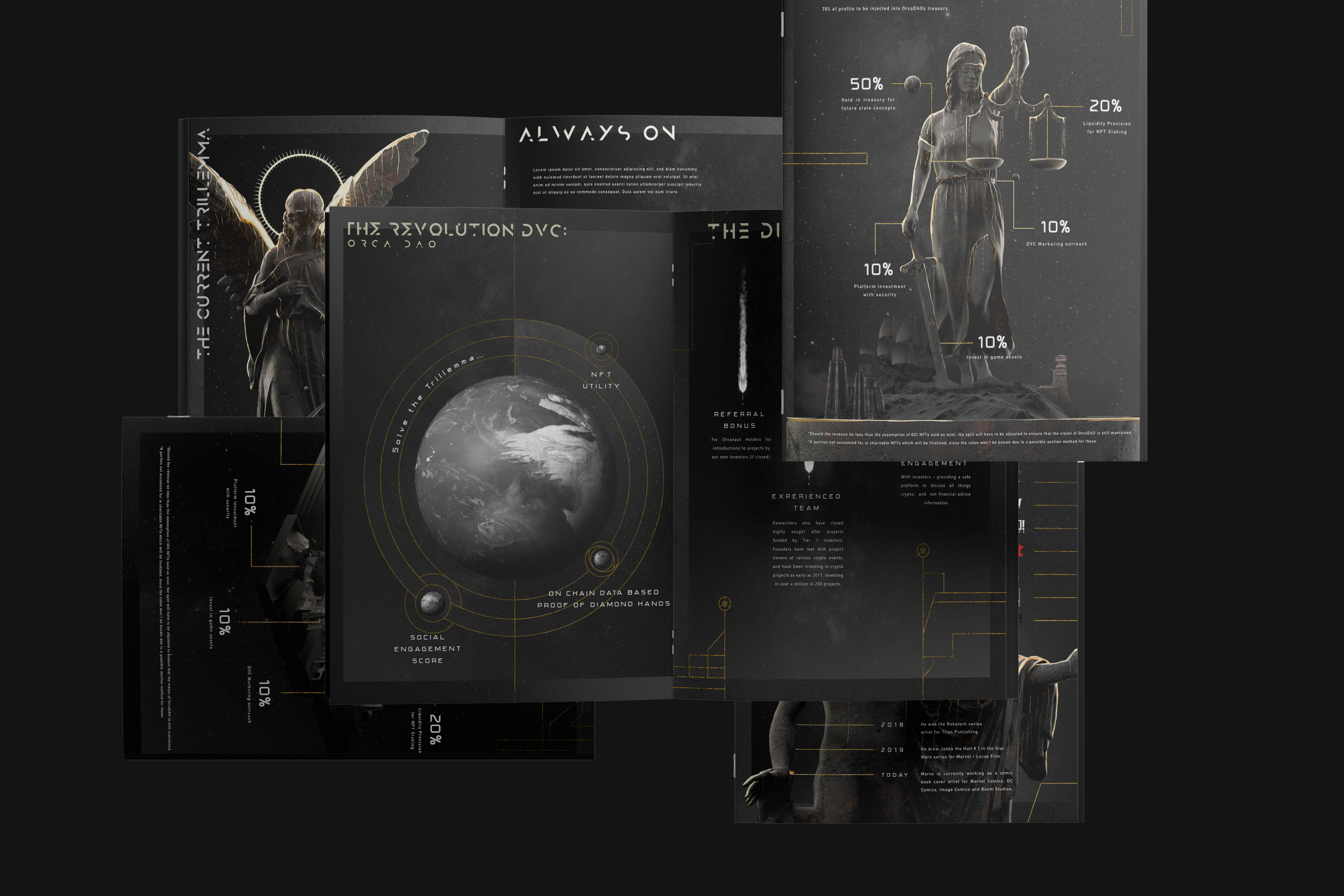 Orca is an emerging US & South Africa based Decentralized Venture Capital aimed at Crypto Investors, NFT collectors, Art Enthusiasts, Gamers, & Metaverseusers. The design and comunication project initially consisted in redesigning the NFT´s white paper, including text layout, infographic design and 3D renders. Later on, the branding was also redesigned as well as the whole visual identity of Orca.