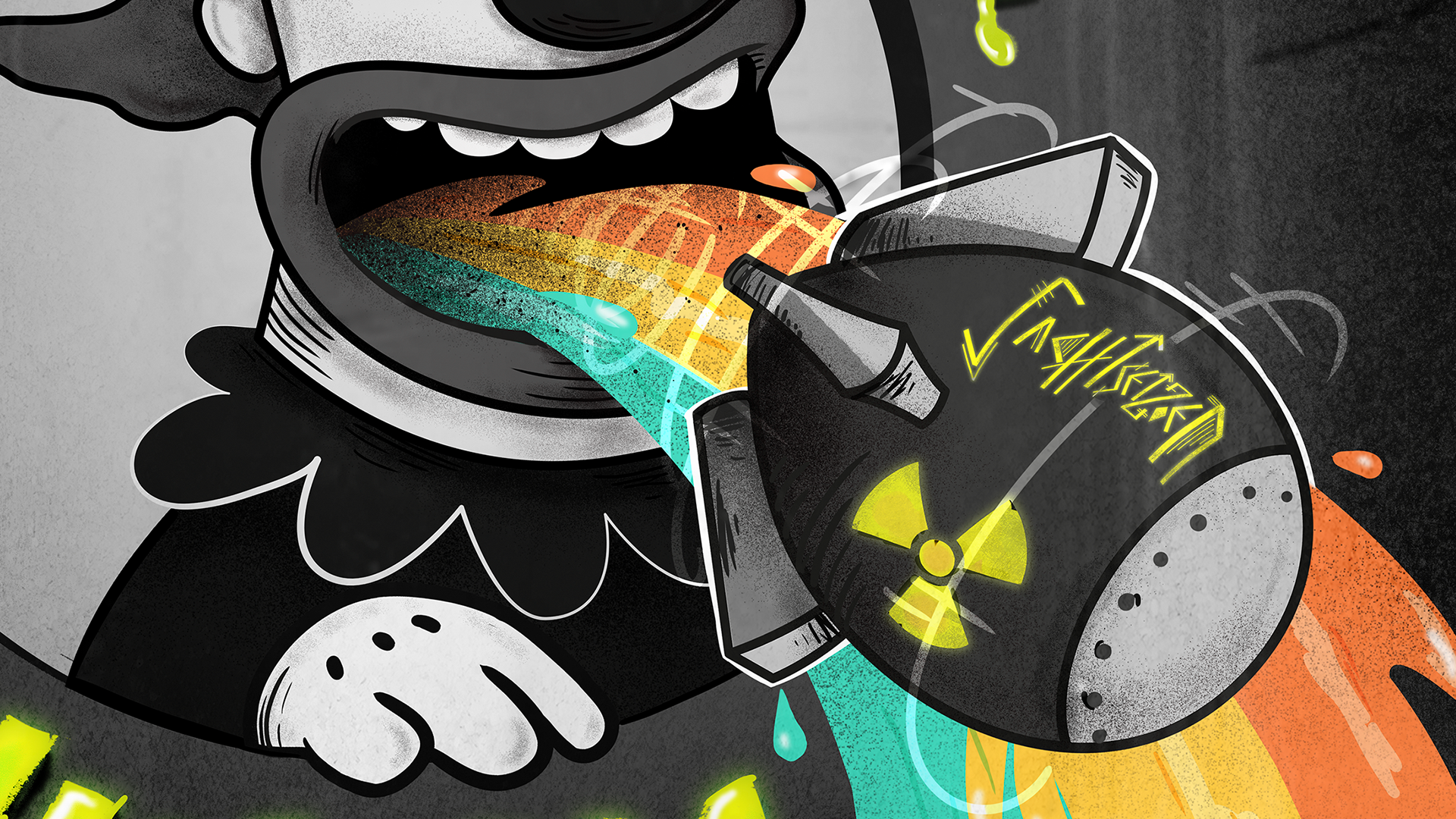The color palette is black and white with hints of color for the absurd elements(like the vomiting bomb).